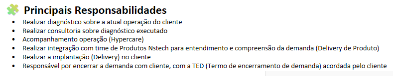 Atuar como consultor especialista na execução de demandas de Services para clientes da Base Ativa de Carteira nstech PSL, com foco no sistema TMS (Transportation Management System. O profissional será responsável por diagnosticar necessidades, propor soluções e realizar a entrega de implantação, parametrização e melhorias operacionais.